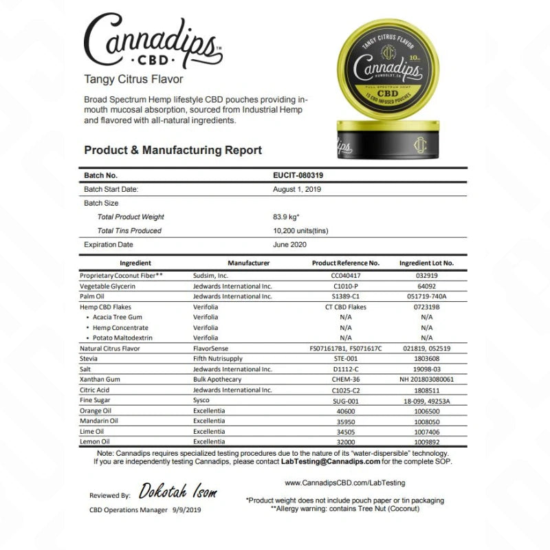 | Cannadips Tangy Citrus CBD Snus Pouches | Organic Palm Oil (17%), Sweeteners (Erythritol), Coconut Fibre, Vegetable Glycerol, Hemp CBD Flakes 16% (Stabilizers: Acacia Gum, Hemp Concentrates, Maltodextrin), Natural Flavouring, Sweeteners (Steviol Glycosides), Salt, Stabilizers (Xanthan Gum). |